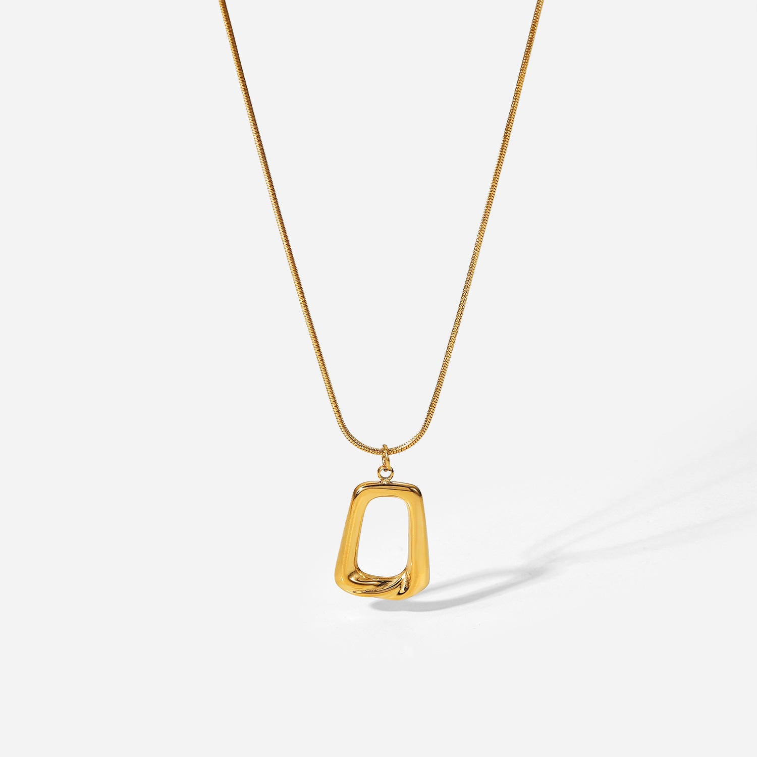 This vintage stainless steel trapezoid necklace features 18K gold plating and a hollow square pendant design, offering a unique geometric style. Made from durable stainless steel, it is suitable for various occasions including weddings, engagements, and anniversaries. The jewelry requires proper care to maintain its appearance, such as avoiding bumps and storing separately to prevent scratches.